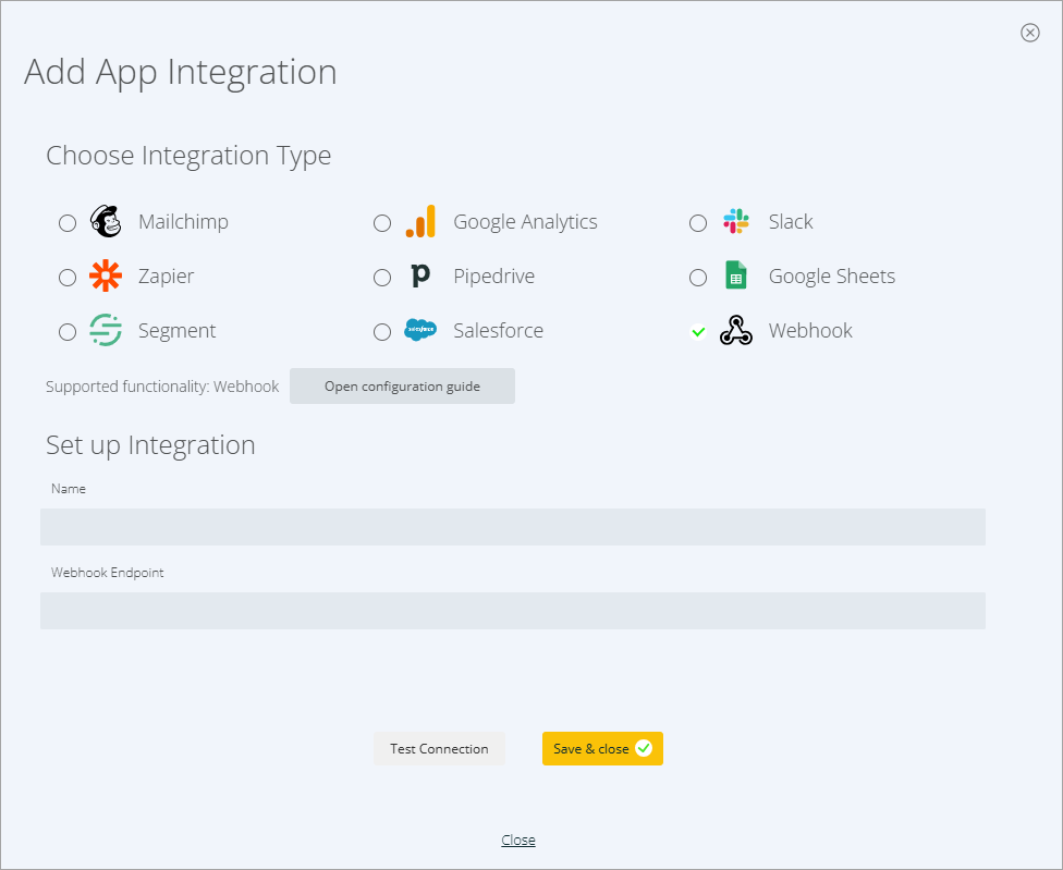 4. Click Test Connection. If a green checkmark appears, move to the next step. If you see a red X, confirm that you have entered the correct Webhook Endpoint and then try again.