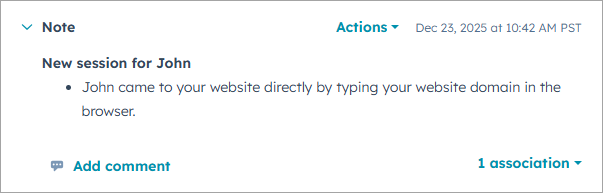 When you enable this feature, when a user visits your site, Bread & Butter checks if they exist in HubSpot, and will then append a post like this in the Notes section under activities: