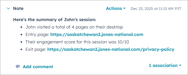 With Bread & Butter, you can know when your users visit your site, and what they did while they were there, all within HubSpot. Simply enable Add note on session open & Add note on session close.