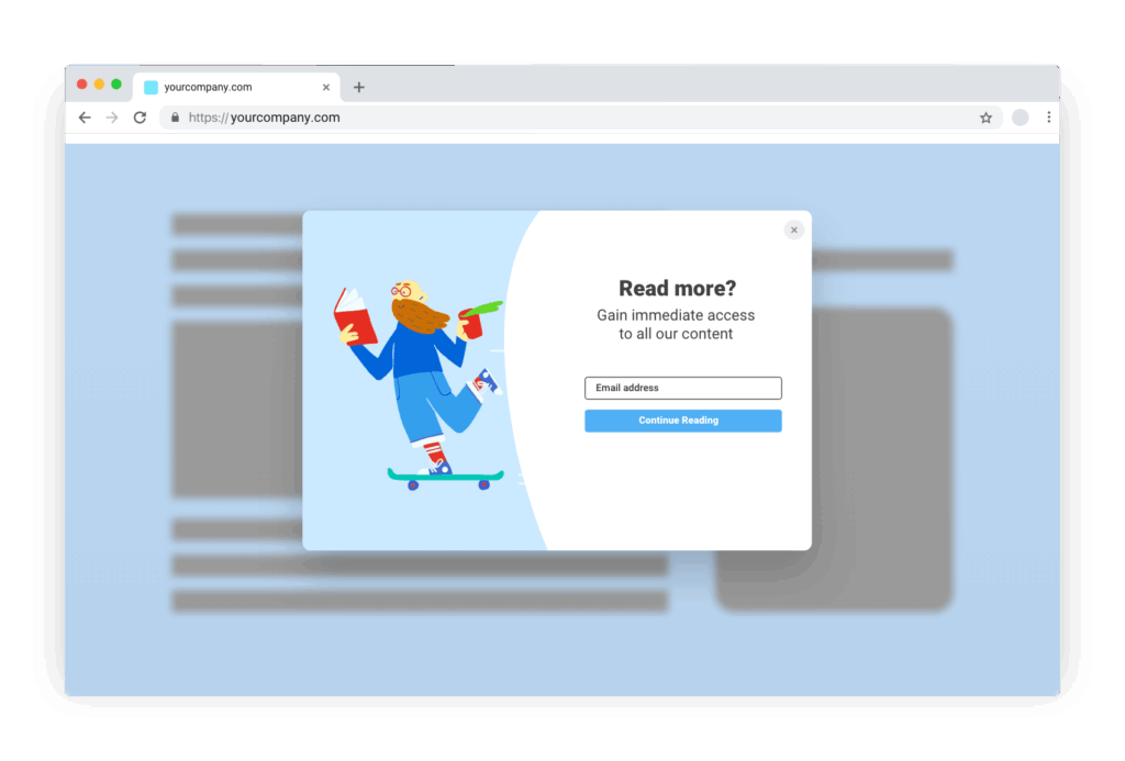 Bread & Butter’s content gate classic feature allows you to limit access to specific web pages on your website to visitors who have converted. When the user goes to the page, the content is partially hidden by the content gate sign-in pop-up, and the background is greyed out, and scrolling is blocked. It can be configured to appear immediately, after a period of time, or when a user scrolls past a certain percentage of the page.