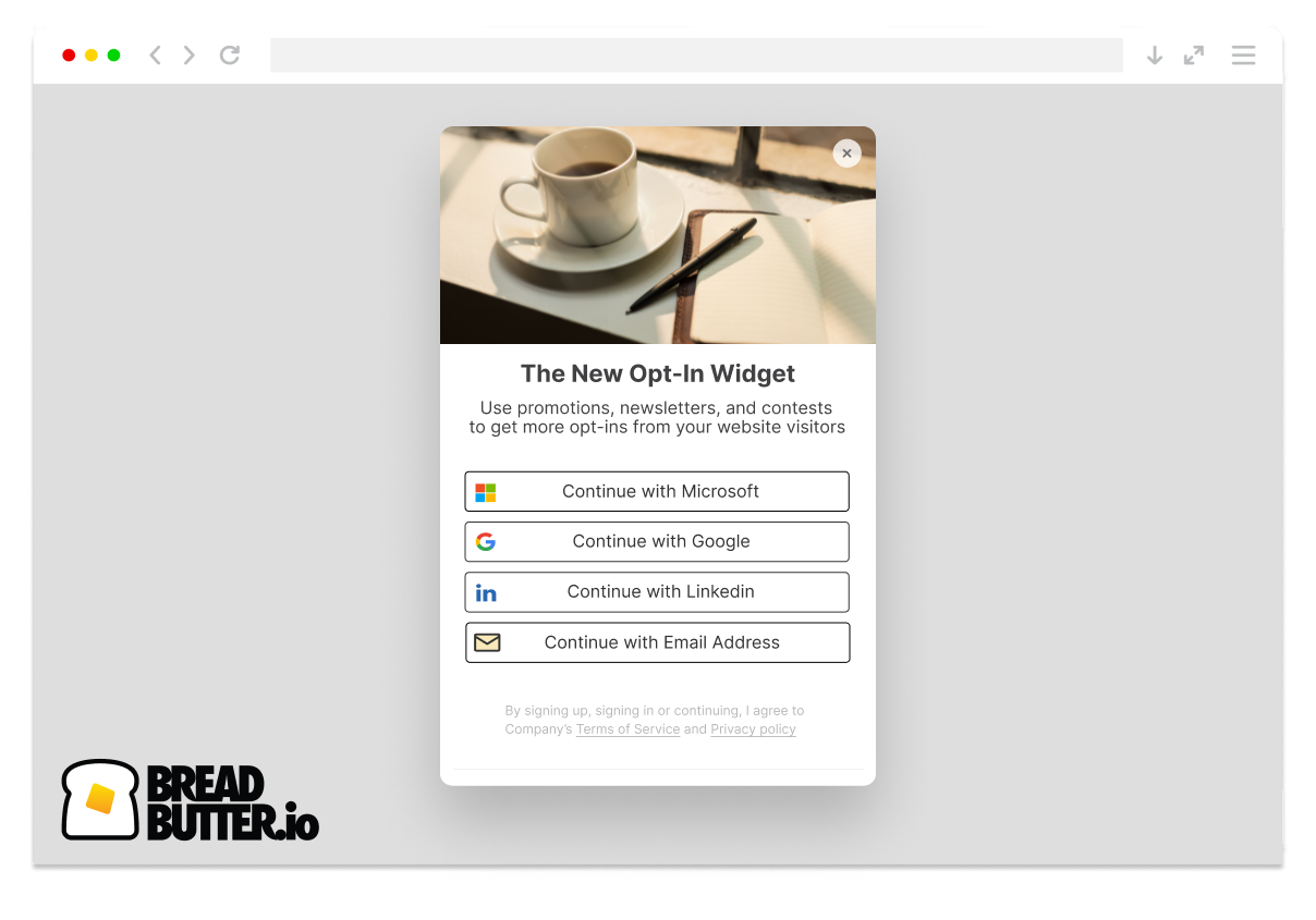 You can add the Bread & Butter Opt-in tool to any page on your site. The Opt-in window appears after a specified number of seconds. It prompts users to subscribe through a trusted account or using an email address.